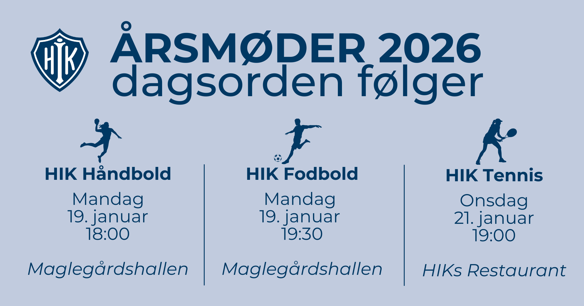 HIK Håndbold holder årsmøde samme dag, mandag den 19. januar kl. 18:00, ligeledes i Maglegårdshallen.